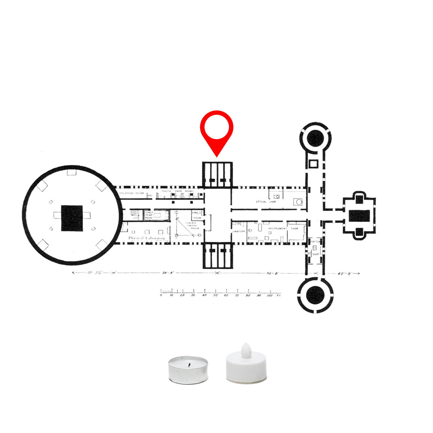 Fig. 2. Coppice visual representation of Observatory Sound, disc two from Draw Agreement (Ferns Recordings, 2023), including the plan (photograph copy) of the main floor published in George Ellery Hale’s “The Yerkes Observatory of the University of Chicago, II. The building and minor instruments,” Astrophysical Journal 5 (April 1897), from University of Chicago Photographic Archive, [apf6-00076], Special Collections Research Center, University of Chicago Library. (© Future Vessel)