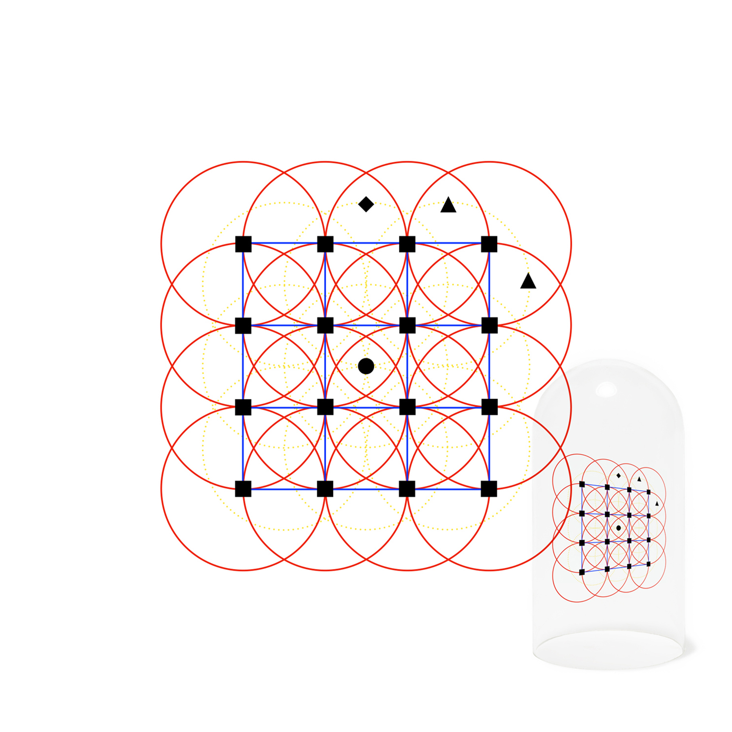 Fig. 3. Coppice visual representation of the spatial scheme of the Chicago Laboratory for Electroacoustic Theatre (CLEAT), a 16-channel sound system and 2.1 PA system housed in Elastic Arts, Chicago, and its binaural capture and elaboration, Sonic Observation (2022), disc three from Draw Agreement (Ferns Recordings, 2023). (© Future Vessel)