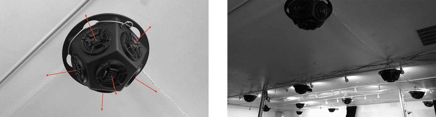 Fig. 4. Detail view of the Chicago Laboratory for Electroacoustic Theatre’s (CLEAT) hemispherical speaker system of 16 independent channels with 6 mono loudspeakers each, designed by Stephan Moore. (© Future Vessel)