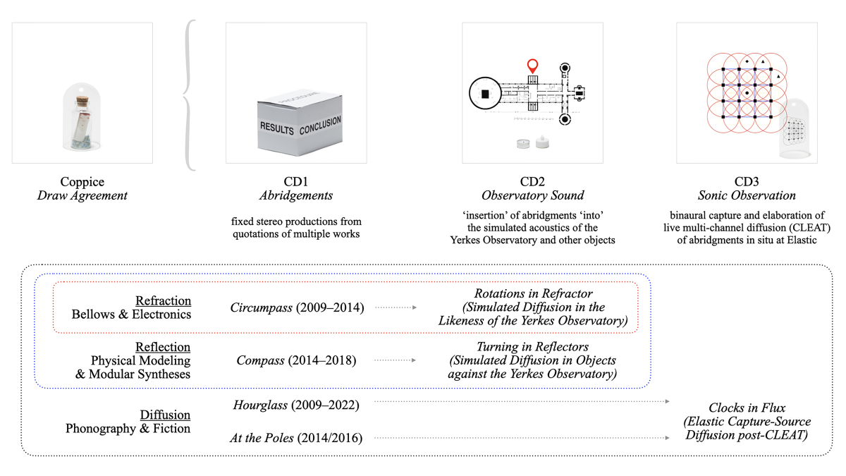 As metaphorical devices, refraction, reflection and diffusion characterize each study, while the observatory gives structure to Coppice’s narration of its overarching musical experiment. Extending from the audio paper, the three-part retrospective Draw Agreement offers a sequence of auditory and technological effects that build upon another. The first disc, Abridgements, presents abbreviations of each study, and the second a third discs ‘frame’ those abridgments: Observatory Sound in the simulated likeness of the Yerkes Observatory’s acoustics, and Sonic Observation in an actual performance space. Nesting and manipulating each study’s timelines, Bellows & Electronics (2009-2014) in allusion to Refraction, Physical Modeling & Modular Syntheses (2014-2018) in allusion to Reflection, and Phonography & Fiction (2018-2022) in allusion to Diffusion, Draw Agreement inscribes a spatiotemporal synthesis of Coppice 2009–2022.